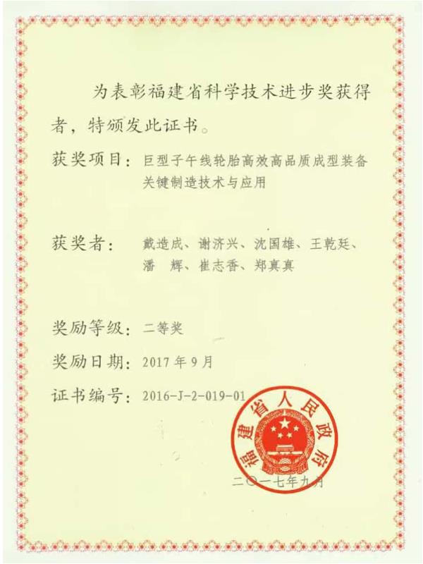 福建省2016年度科學(xué)技術(shù)進(jìn)步獎二等獎-巨型子午線輪胎高效高品質(zhì)成型裝備關(guān)鍵制造